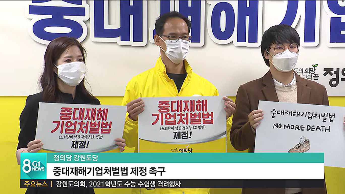 정의당 강원도당은 택배 과로사 등 노동자에게 산업재해가 발생하면 기업주를 처벌할 수 있게 하는 내용의 '중대재해기업처벌법' 제정을 촉구하고 나섰습니다.