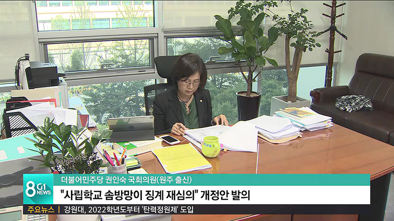 원주 출신 더불어민주당 권인숙 의원이 사립학교 법인이 비위 교직원에 대해 징계를 가볍게 했을 경우, 시.도 교육청 징계 재심의기구에서 심의하도록 하는 사립학교법 일부 개정 법률안을 대표 발의했습니다.