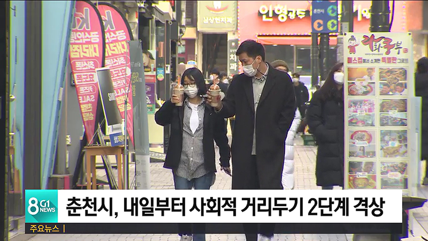 춘천시는 내일 새벽 0시부터 코로나 대응 사회적 거리두기 단계를 2단계로 격상한다고 밝혔습니다.
