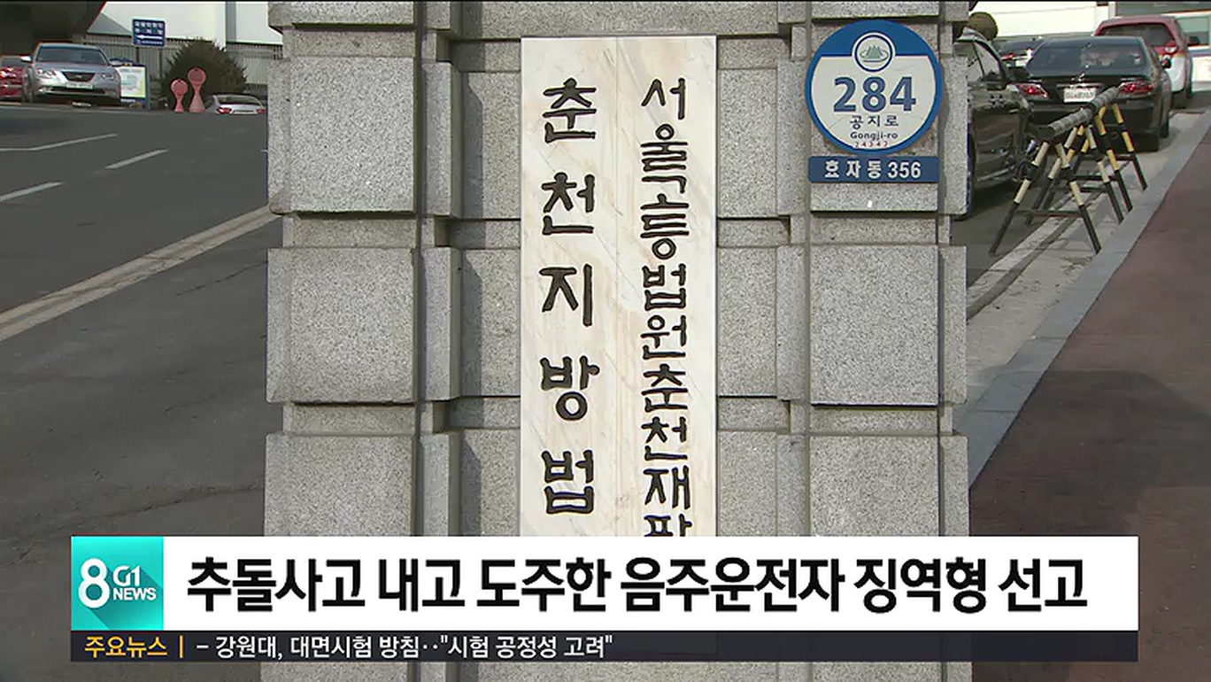 춘천지법 형사2단독 박진영 부장판사는 특정범죄가중법상 도주치상과 도로교통법 위반 혐의로 기소된 61살 A씨에게 징역 1년 6개월에 집행유예 3년을 선고했습니다.