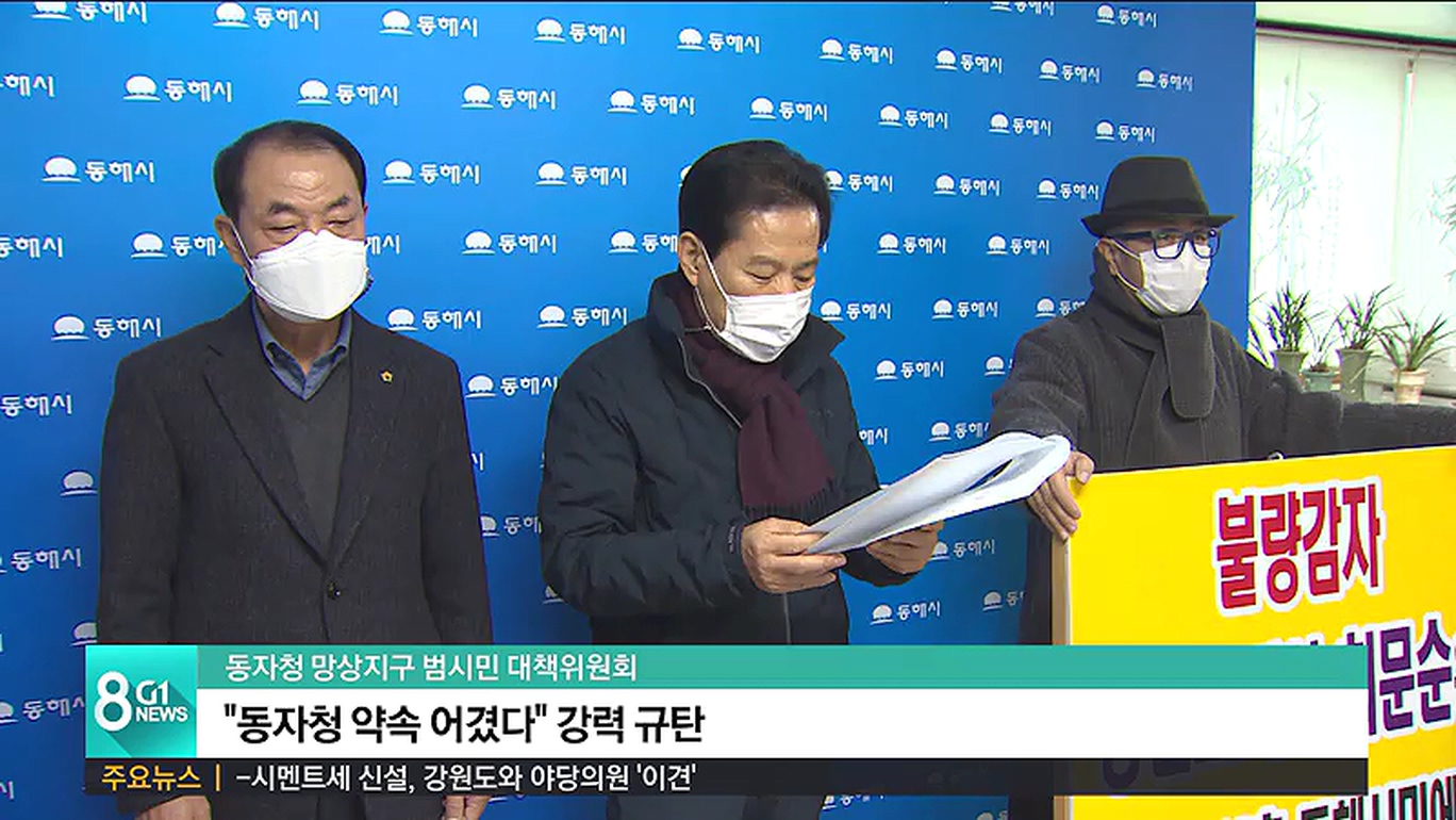 동해안권 경제자유구역 망상지구 범시민 비상대책위원회가 기자회견을 열고, 동자청이 시민들과 한 약속을 지키지 않고 있다며 규탄했습니다.