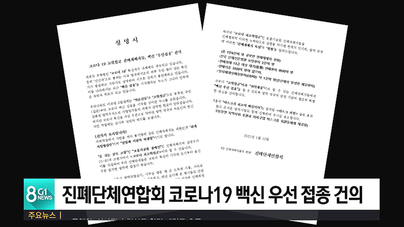진폐단체연합회는 오늘(12일) 성명을 통해 "산업화 시절의 희생양인 진폐 재해자는 코로나19의 최고 위험군에 속한다"며 "백신을 우선 접종할 수 있도록 방역당국의 조치가 필요하다"고 요구했습니다.