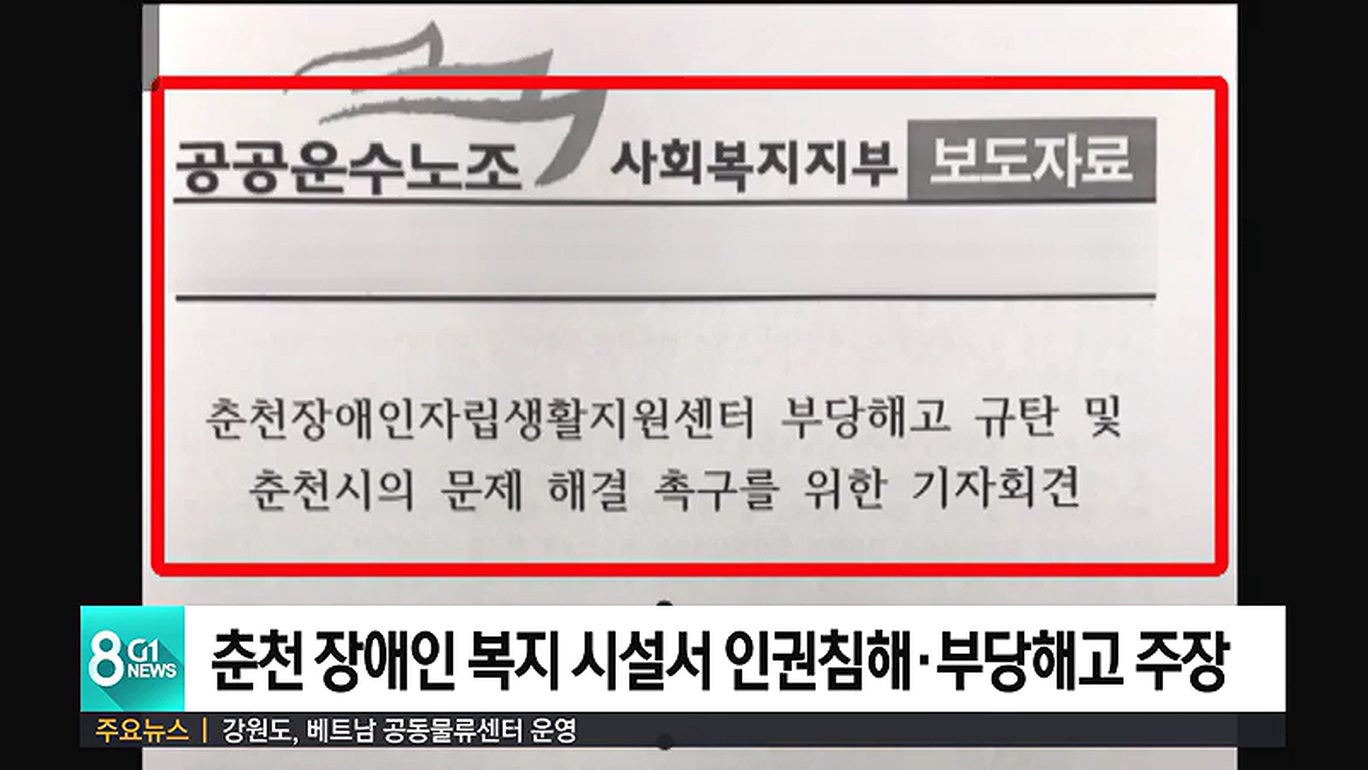 공공운수노조 사회복지 지부는 춘천시로부터 민간위탁을 받아 운영하는 장애인 복지시설에서 노동자를 상대로 한 직장 내 괴롭힘과 인권침해가 있었고, 일부 노동자들은 정당한 사유 없이 해고됐다고 주장했습니다.