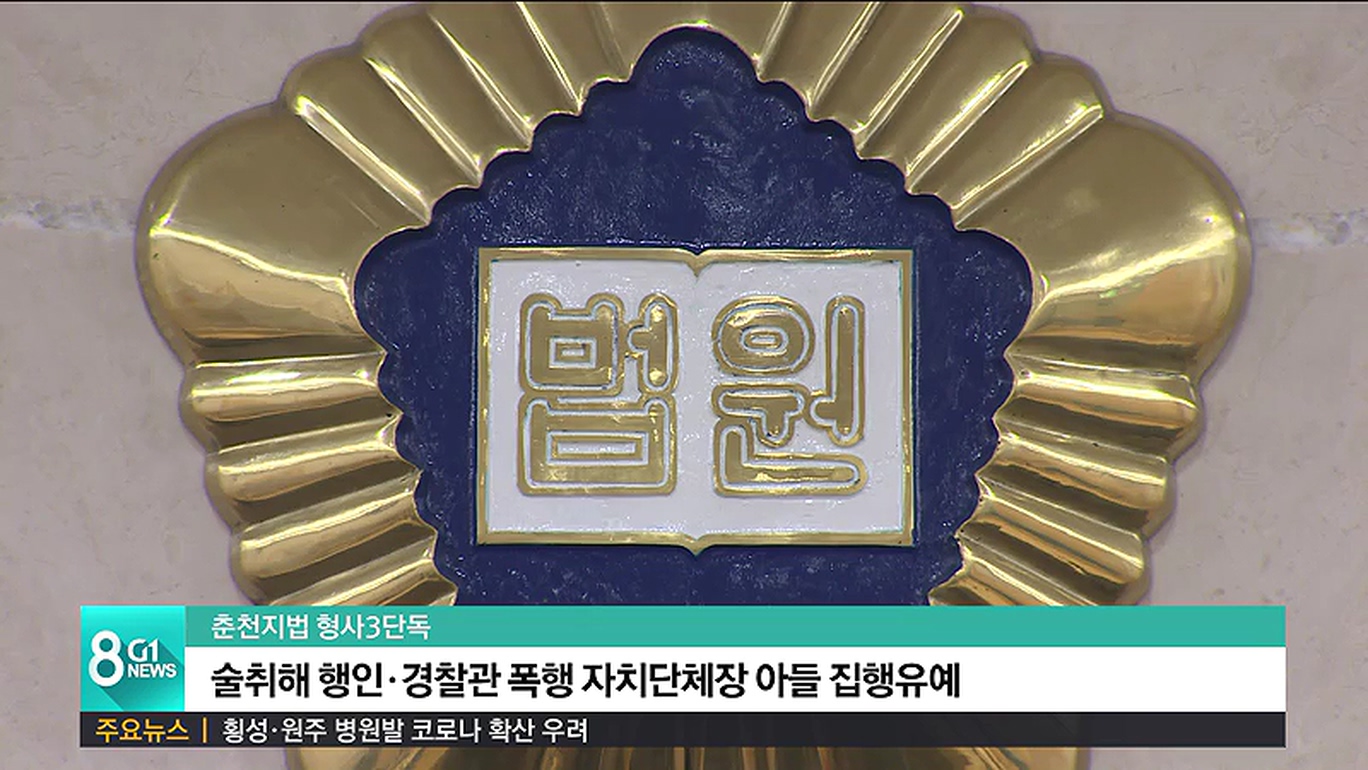 술에 취해 행인과 신고를 받고 출동한 경찰관 에게 폭력을 행사한 도내 현직 자치단체장 아들이 징역형의 집행유예를 선고받았습니다.