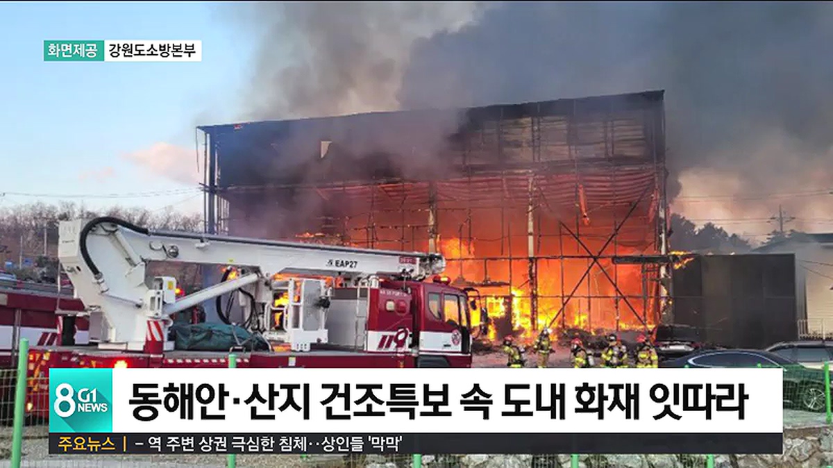 동해안과 산간 지역에 건조주의보가 내려진 오늘 도내 곳곳에서 크고 작은 화재가 잇따랐습니다.