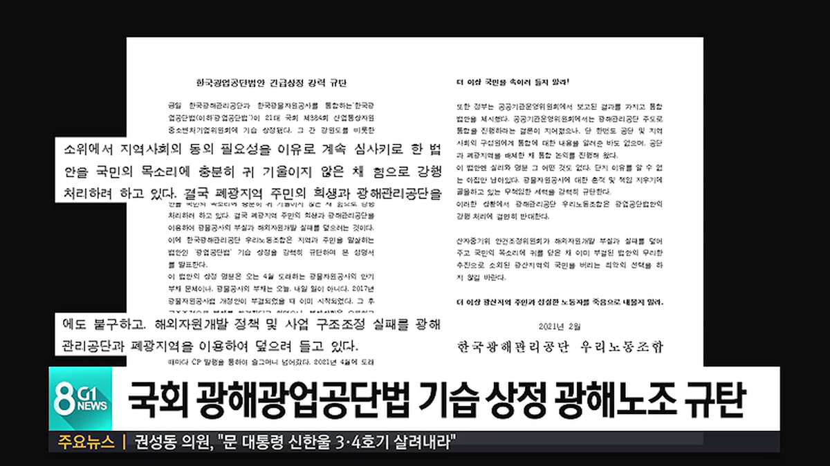 노조는 "집권여당이 국회 법안 소위에서 지역사회의 동의 필요성을 이유로 계속 심사하기로 한 한국광해공업공단법을 강행 처리했다"며 "광해관리공단을 이용해 광물자원공사의 부실과 해외 자원 사업 실패를 덮으려 한다"고 규탄했습니다.