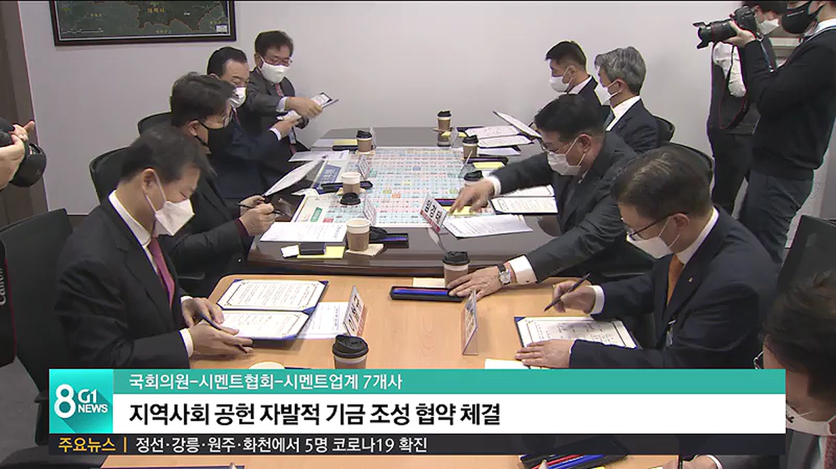 권성동, 이철규, 유상범 의원 등 시멘트 생산지역 국회의원과 시멘트 제조 기업체 대표들은 오늘 국회에서 '지역 사회 공헌 확대를 위한 자발적 기금 조성' 협약을 맺었습니다.