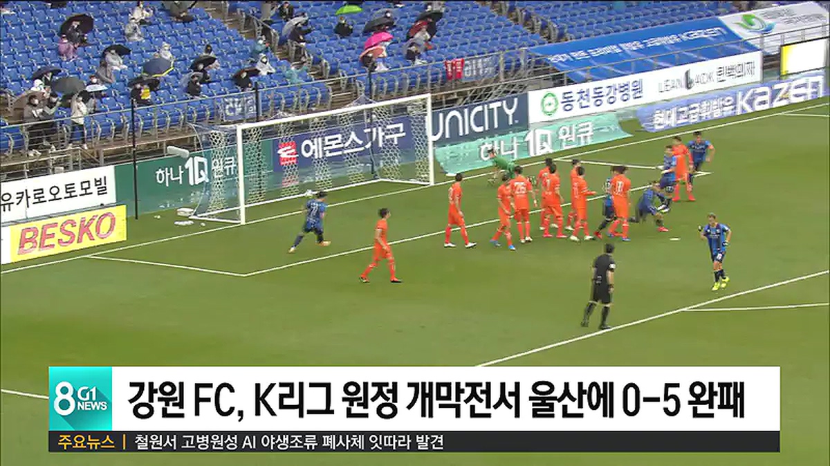 강원 FC는 오늘(1일) 오후, 울산 문수경기장에서 열린 울산 현대와의 경기에서 0대 5로 패했습니다.