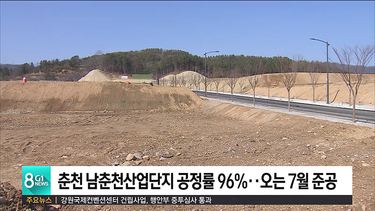 춘천시는 사업비 511억 원을 투입해 남산면 광판리와 동산면 군자리 일대 145만여㎡ 부지에 조성하고 있는 남춘천산업단지의 공정률이 96%로, 오는 7월 준공될 예정이라고 밝혔습니다.