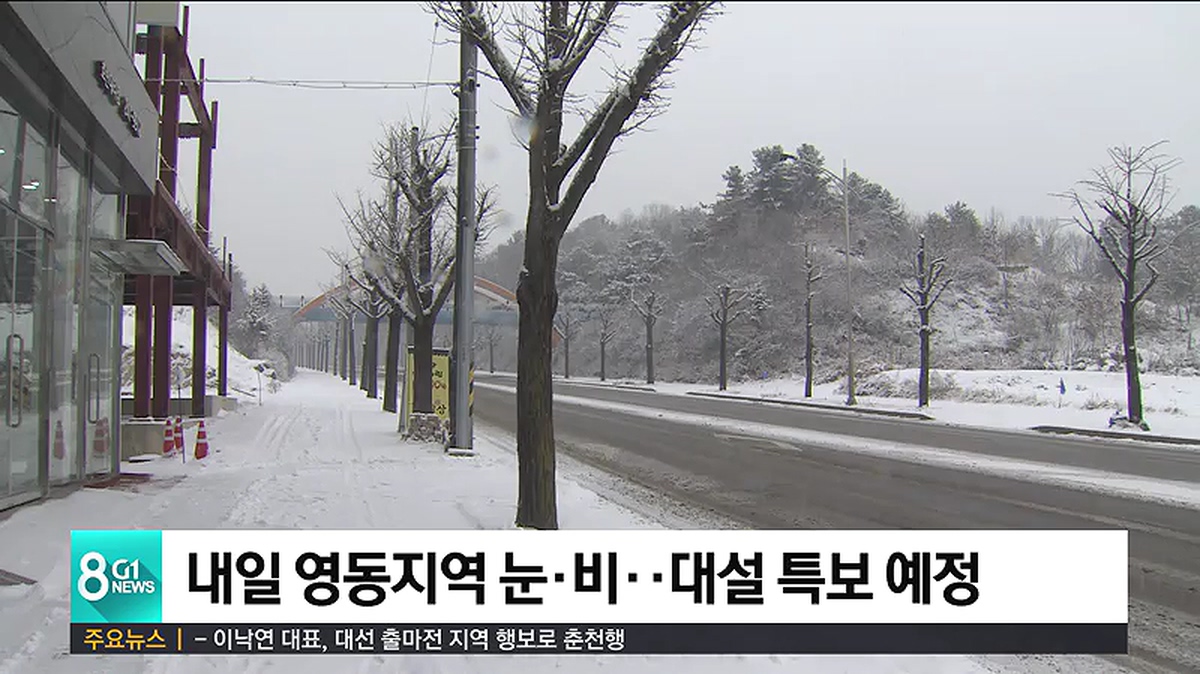 내일 아침 강릉과 동해 등 영동권 6개 시·군과 산지에는 대설 특보가 발효될 예정입니다.