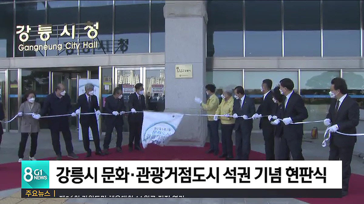 강릉시는 오늘 시청 정문 현관에서 박양우 전 문체부장관과 문화예술, 관광 분야의 단체장이 참석한 가운데 법정 문화 도시와 관광거점 도시로 지정된 것을 기념했습니다.