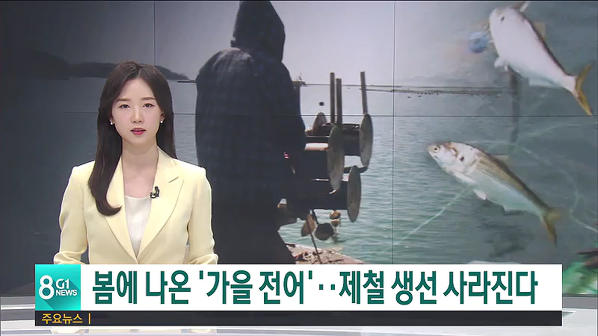 - "가을 제철 생선으로 알려진 전어가 보시는 것처럼 상당량이 잡히고 있습니다. 숭어도 예전보다 나오는 시기가 빨라졌습니다."