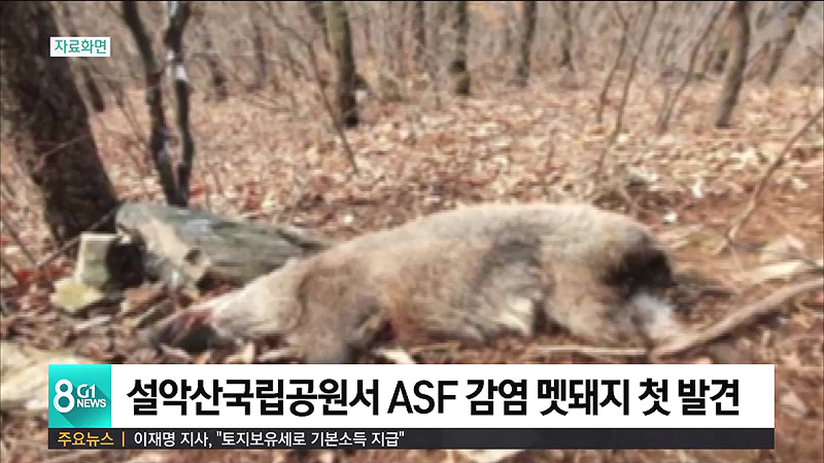 설악산국립공원사무소는 지난 19일 인제군 북면 용대리 설악산국립공원 백담사 방면 계곡에서 발견된 멧돼지 폐사체 1마리에서 ASF 바이러스가 검출됐다고 밝혔습니다.
