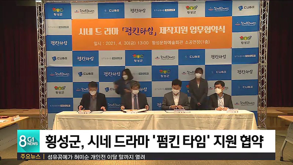횡성군은 오늘 횡성문화예술회관에서 제작사 큐브엔터테인먼트, 스튜디오 노움과 시네 드라마 '펌킨 타임' 제작지원 협약을 맺었습니다.