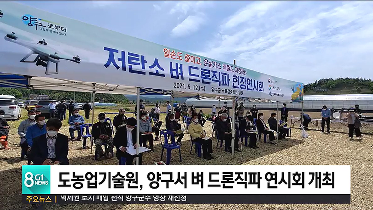 강원도농업기술원이 벼 재배농가의 생산비 절감을 돕기 위해 오늘(12일) 양구에서 벼 드론직파 기술 연시회를 개최했습니다.