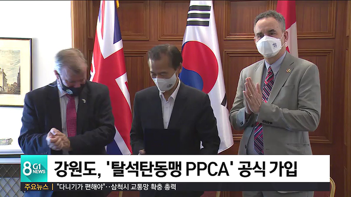 최문순 강원도지사는 서울 주한 영국대사관에서 사이먼 스미스 주한 영국대사, 마이클 대나허 주한 캐나다 대사와 함께 '탈석탄동맹' 가입에 서명했습니다.