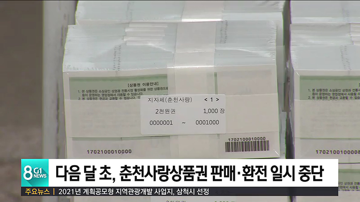 춘천시는 춘천사랑상품권의 관리시스템이 일부 변경됨에 따라, 다음달 3일부터 9일까지 종이상품권의 판매가 일시 중단된다고 밝혔습니다.