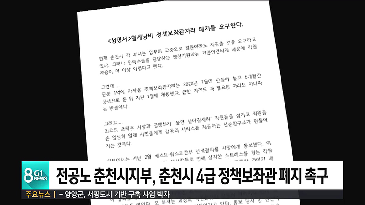 전국공무원노조 춘천시지부는 춘천시가 현재 공모 중인 4급 상당의 춘천시 정책보좌관 직을 폐지해야한다고 촉구했습니다.