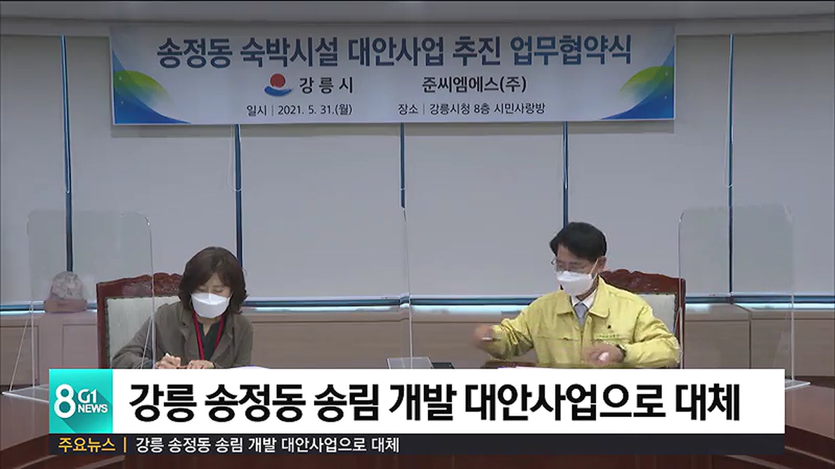 강릉시와 송정동 숙박시설 사업시행자는 강릉시청에서 송정동 숙박시설 대안사업으로 교동에 공동주택사업을 추진하기로 하고 업무협약을 맺었습니다.