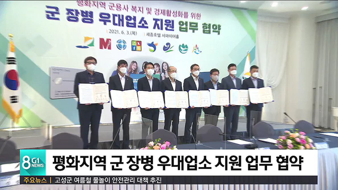 강원도와 도내 평화지역 5개 시·군, 군인공제회 등 8개 기관은 춘천 세종호텔에서 업무 협약을 맺고,