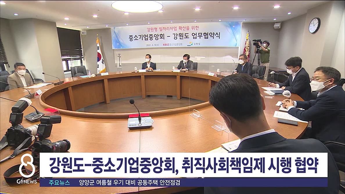 강원도가 전국 최초로 도입한 '취직사회책임제'를 확대하기 위해 중소기업 중앙회와 업무 협약을 맺었습니다.
