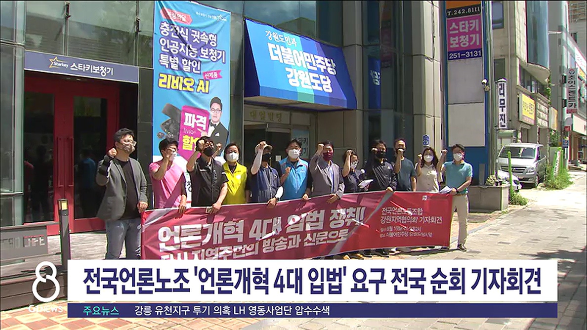 전국언론노동조합은 오늘 더불어민주당 강원도당 앞에서 기자회견을 열고, 언론개혁 4대 입법 쟁취를 통한 지역언론 살리기를 촉구했습니다.