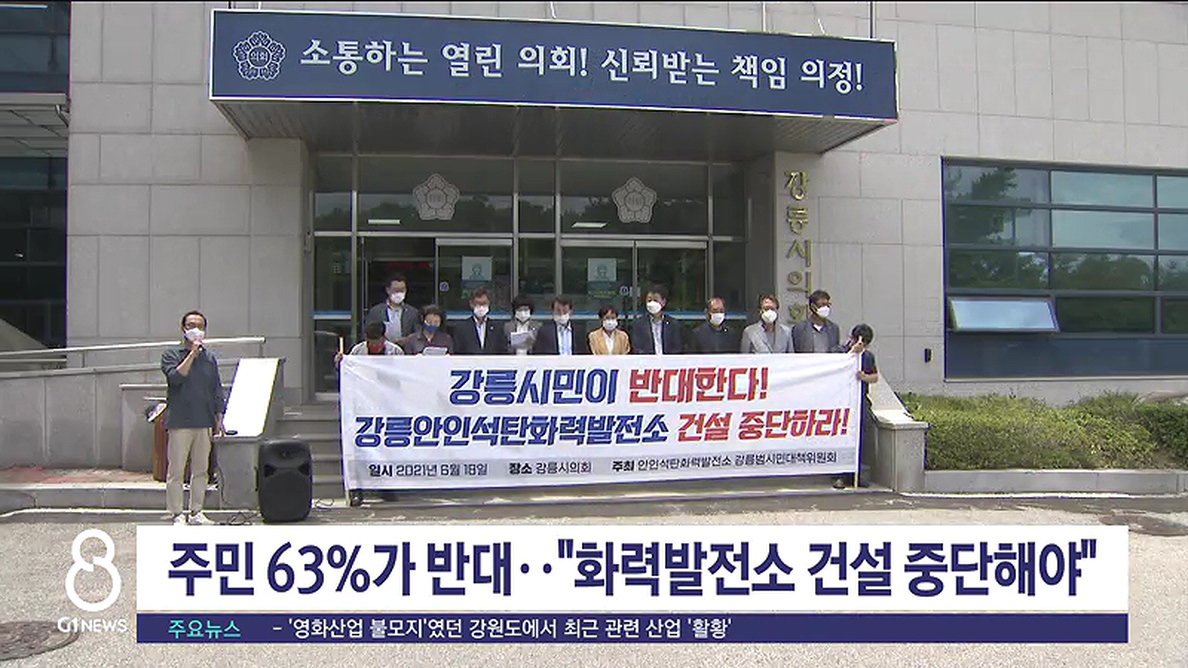 안인석탄화력발전소 강릉범시민대책위원회가 오늘 강릉 시민을 대상으로 한 설문조사 결과를 발표하고, 공사 중단을 요청했습니다.