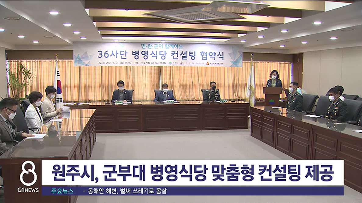 원주시와 한국외식업중앙회 원주시지부, 육군 36보병사단은 오늘 시청 투자상담실에서 장병 병영식당 맞춤형 컨설팅을 위한 업무협약을 체결했습니다.