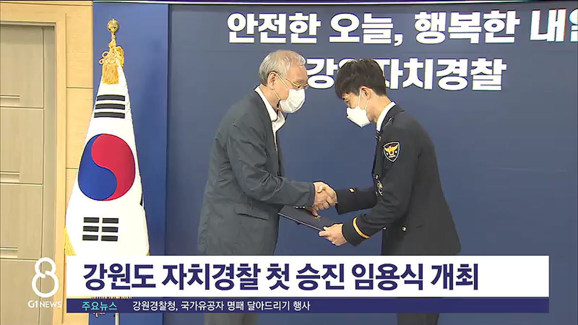 송승철 강원도 자치경찰위원장은 오늘 도청에서 춘천경찰서 소속 승진자 대표 두 명에게 경장 임명장을 전달했습니다.