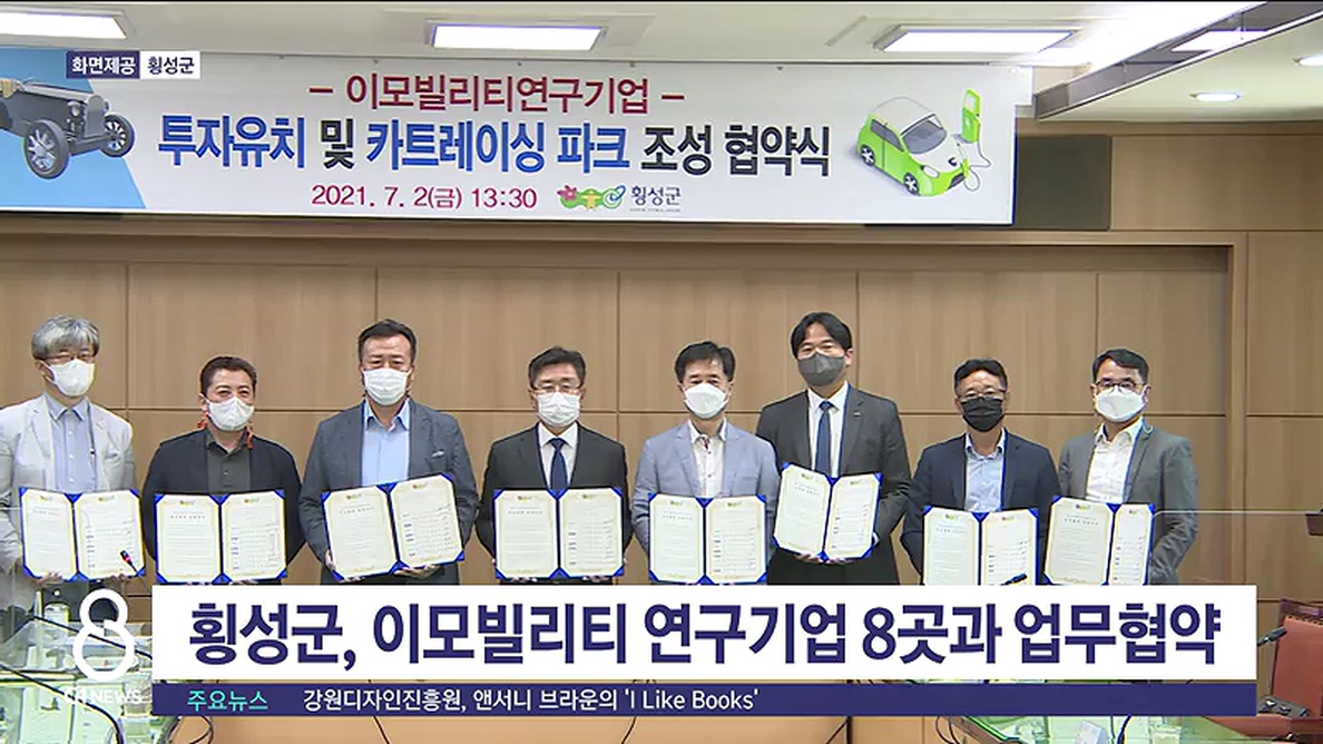 횡성군은 오늘 군수 집무실에서 전기차와 자율주행 등 이모빌리티 연구기업 8곳과 업무협약을 체결했습니다.