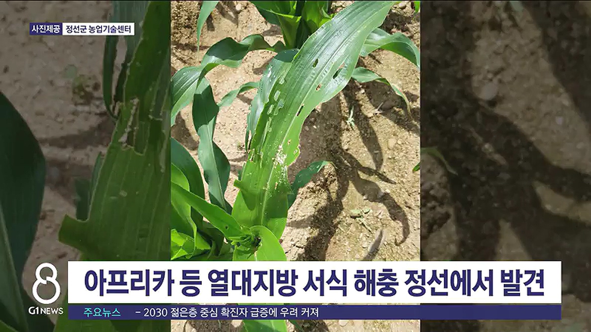 정선군 농업기술센터에 따르면, 어제(21일) 여량면과 임계면의 한 옥수수 밭에서 열대거세미나방 유충이 발견돼 긴급 방제에 나섰습니다.