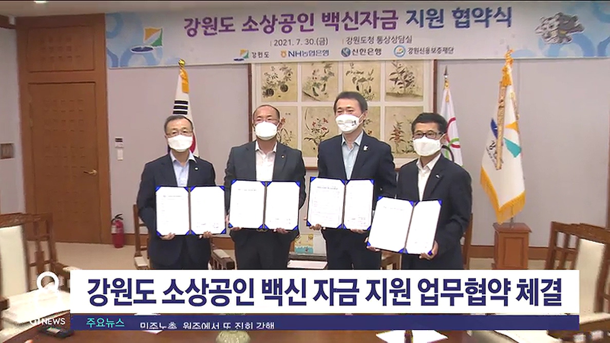강원도와 농협·신한은행·강원신용보증재단은 '강원도 소상공인 백신자금 업무 협약'을 맺고, 기존 정책자금 융자를 받아 보증한도가 초과한 소상공인에 대한 추가 지원을 결정했습니다.