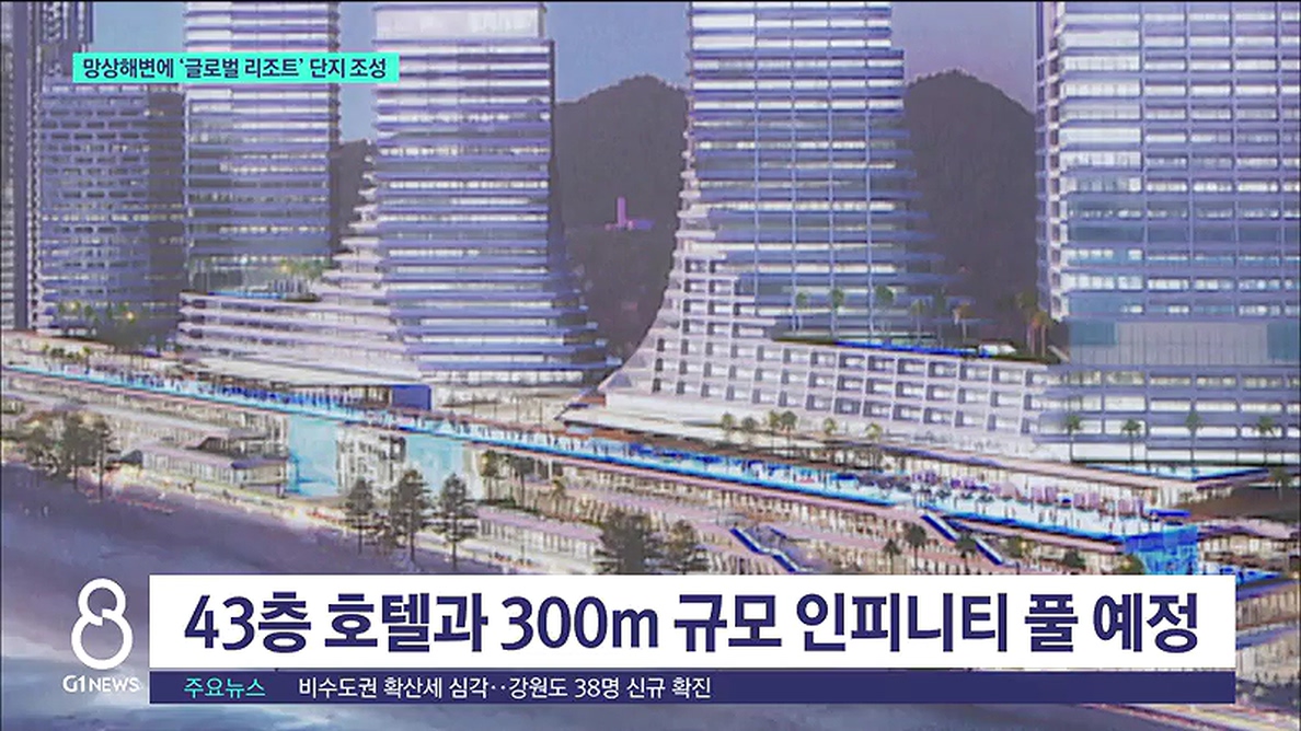 망상해변을 따라 43층 높이의 5성급 호텔이 들어서고, 300m 규모의 인피니티 풀이 생깁니다.
