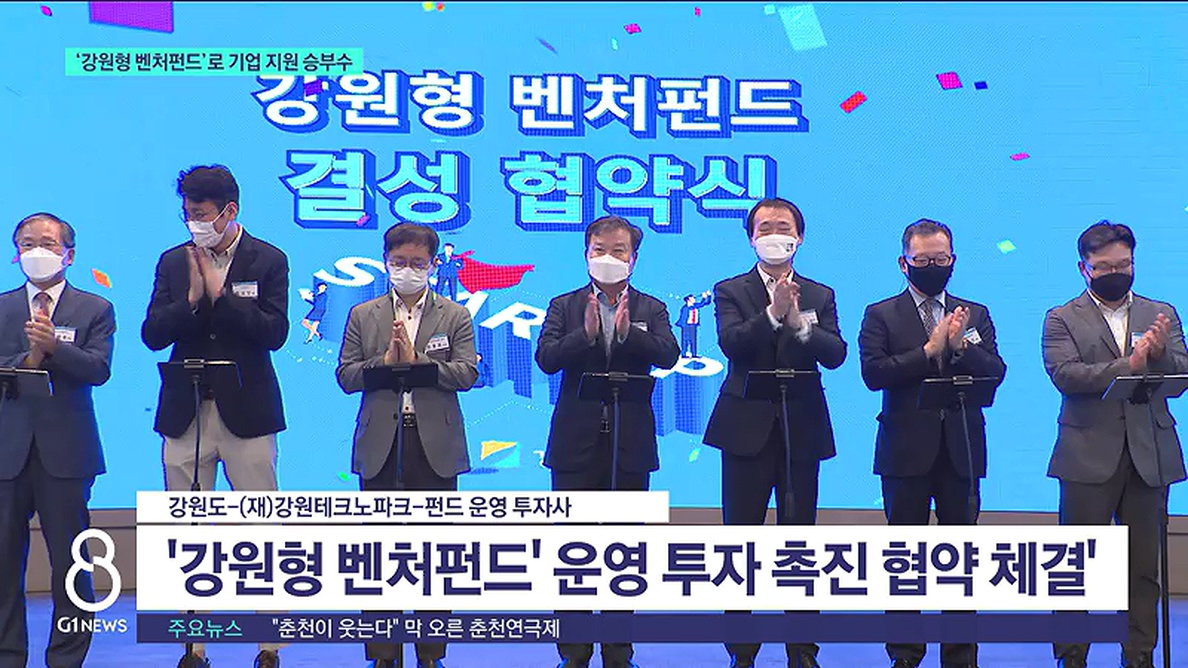 강원도와 강원테크노파크, 4개 펀드 운용사와 6개 펀드 투자사는 '강원형 벤처펀드' 운용과 투자 촉진을 위한 협약을 체결했습니다.
