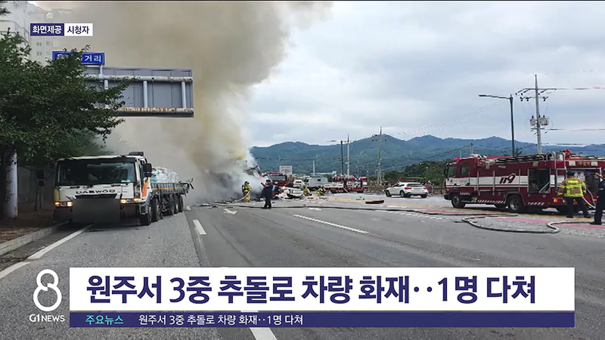 원주서 3중 추돌로 화물차 화재..1명 다쳐