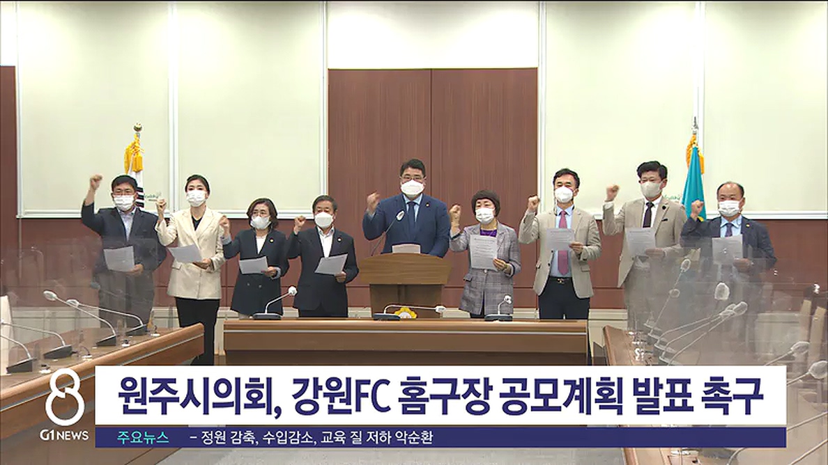 원주시의회 민주당 소속 의원 8명은 "원주시가 예산 절감과 접근성, 지역경제 활성화를 위해 강원FC 축구 전용경기장 건립 의사를 밝혔지만,
