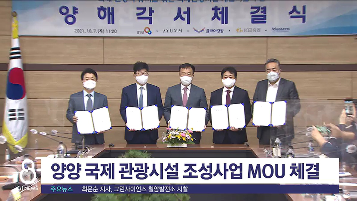 협약식에는 양양군과 플라이강원, 아윰, KB증권, 마스턴투자운용이 참석했습니다.