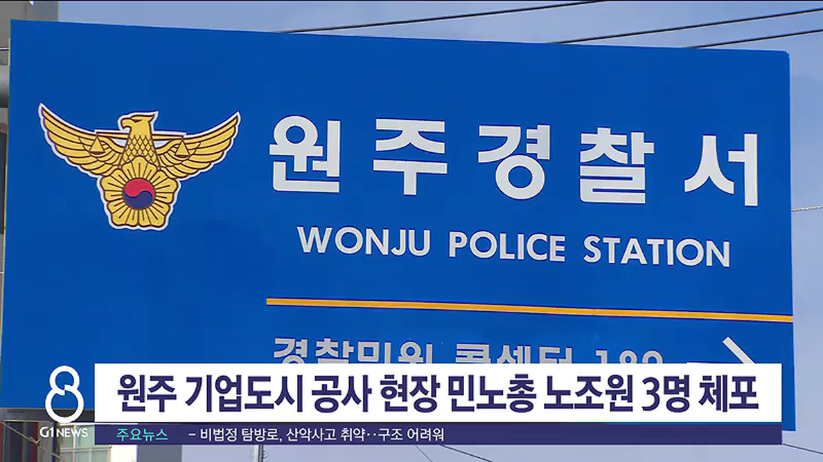 원주경찰서는 오늘(8일) 원주 기업도시의 한 공사 현장에서 민주노총 건설노조 강원지부장 등 노조원 3명을 업무 방해 혐의로 현장 체포했다고 밝혔습니다.