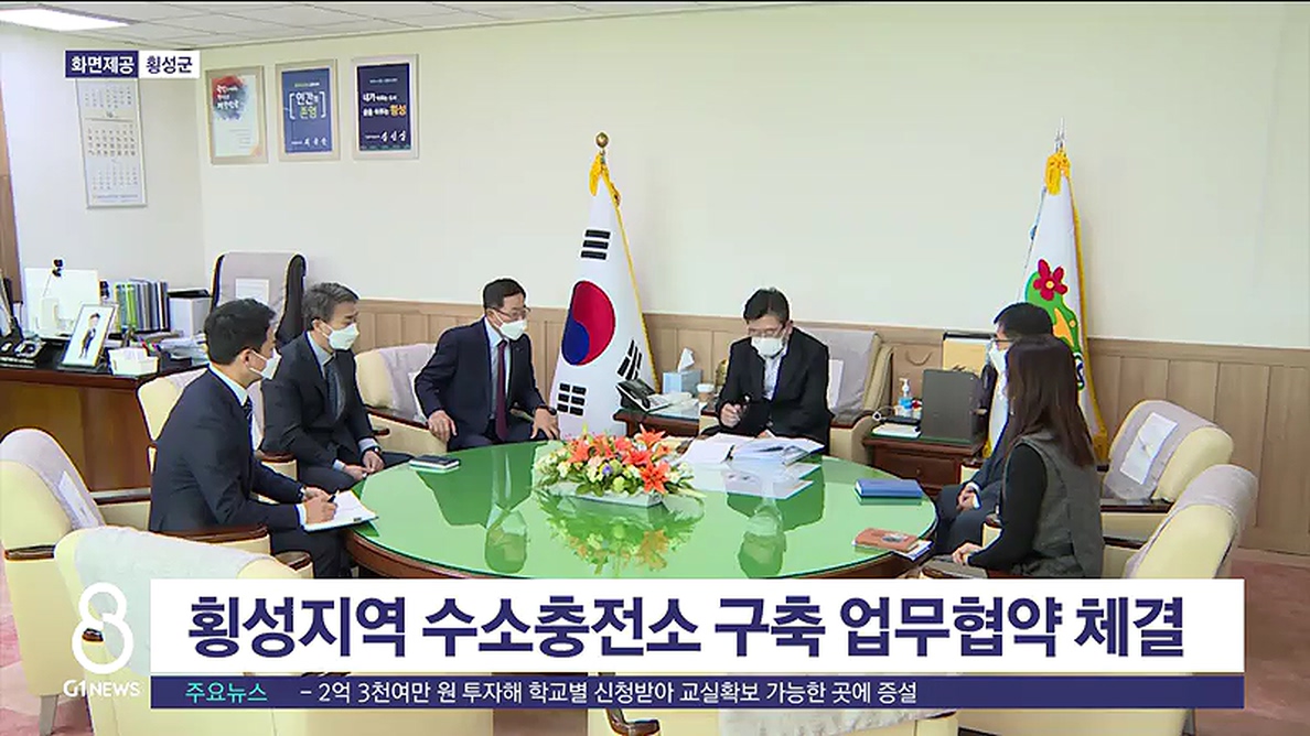 횡성군과 한국가스기술공사는 오늘 횡성군수 집무실에서 수소충전소의 원활한 구축을 위한 업무협약을 체결했습니다.