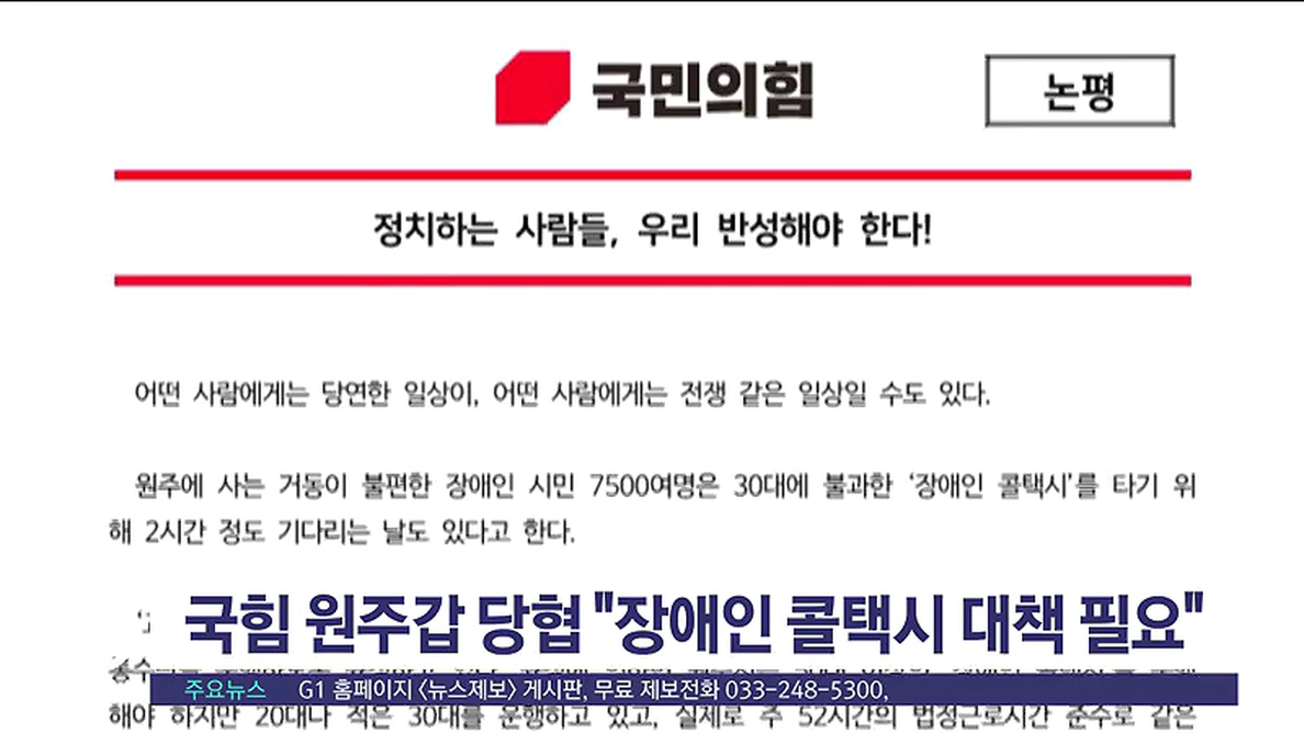 강원도 장애인 콜택시 수가 법정 기준에 턱 없이 못 미친다는 G1보도와 관련해, 국민의힘 원주갑 당협위원회가 대책을 촉구했습니다.
