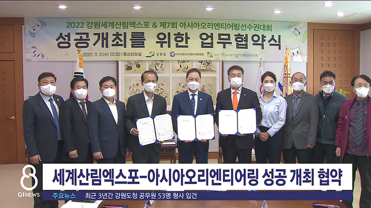 2022 강원 세계산림엑스포와 제7회 아시아 오리엔티어링 선수권대회 성공 개최를 위한 업무 협약이 체결됐습니다.