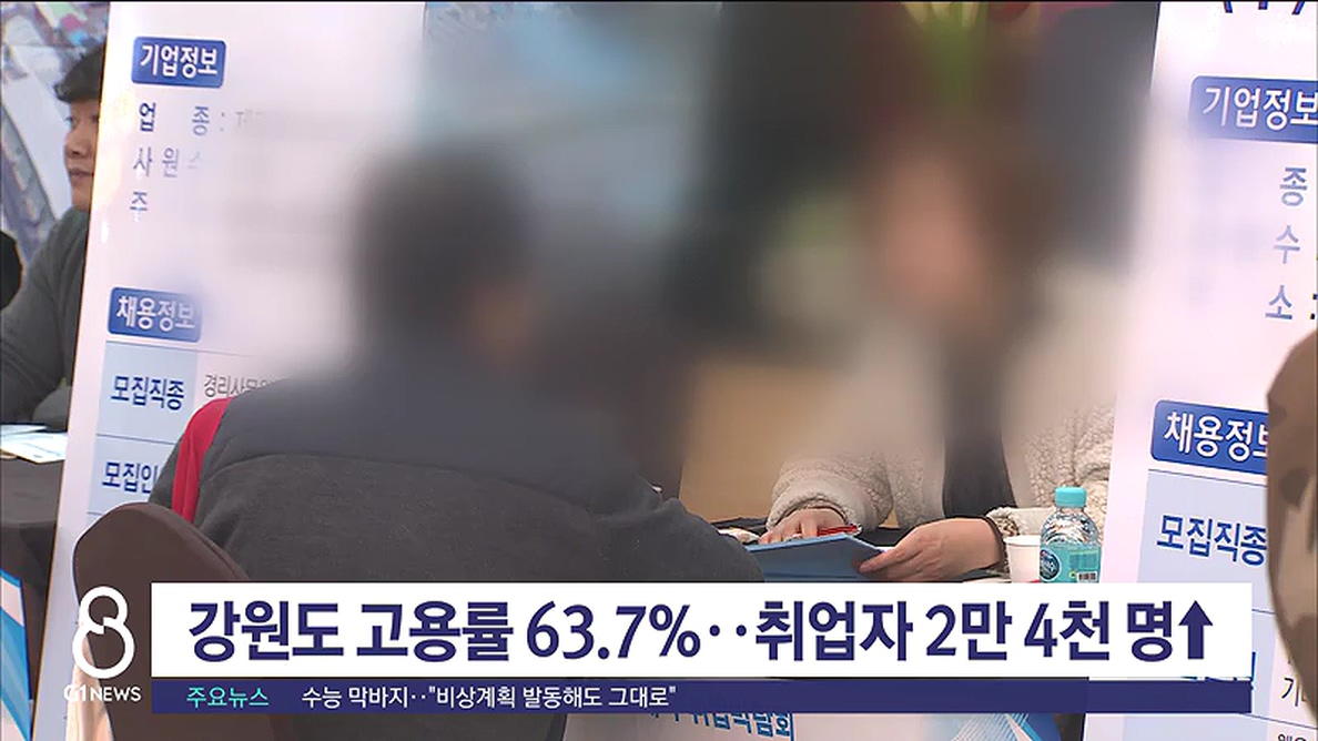 통계청이 발표한 '10월 고용동향'에 따르면, 강원도 고용률은 63.7%로 작년 같은 기간보다 1.3%p 상승했습니다.