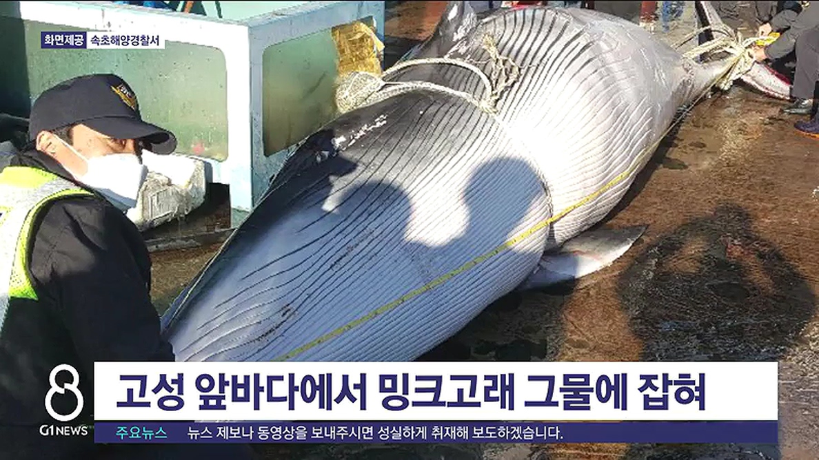 어제(12일) 오전 7시쯤 고성군 대진항 동쪽 7.4km 해상에서 밍크고래 1마리가 그물에 걸려 죽은 채 발견됐습니다.