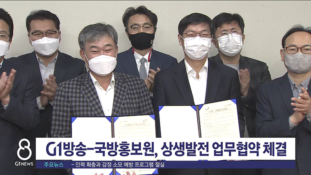 G1방송과 국방홍보원은 오늘, 국방홍보원에서 허인구 G1방송 대표이사와 박창식 국방홍보원장 등이 참석한 가운데, 두 기관의 상생발전을 위한 업무협약을 체결했습니다.