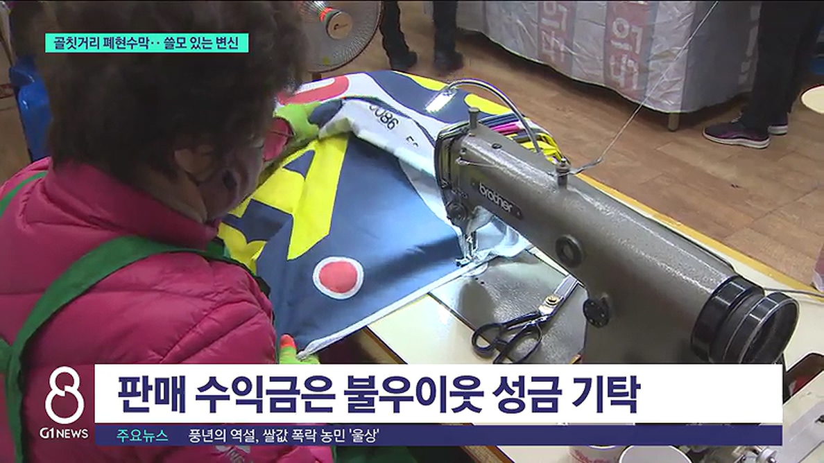 "가정용 재봉틀을 가지고 와서 처음에 시작을 했어요. 하다 보니까 지금 거의 한 3년 됐어요. 마대자루도 만들고 시장바구니도 만들고."
