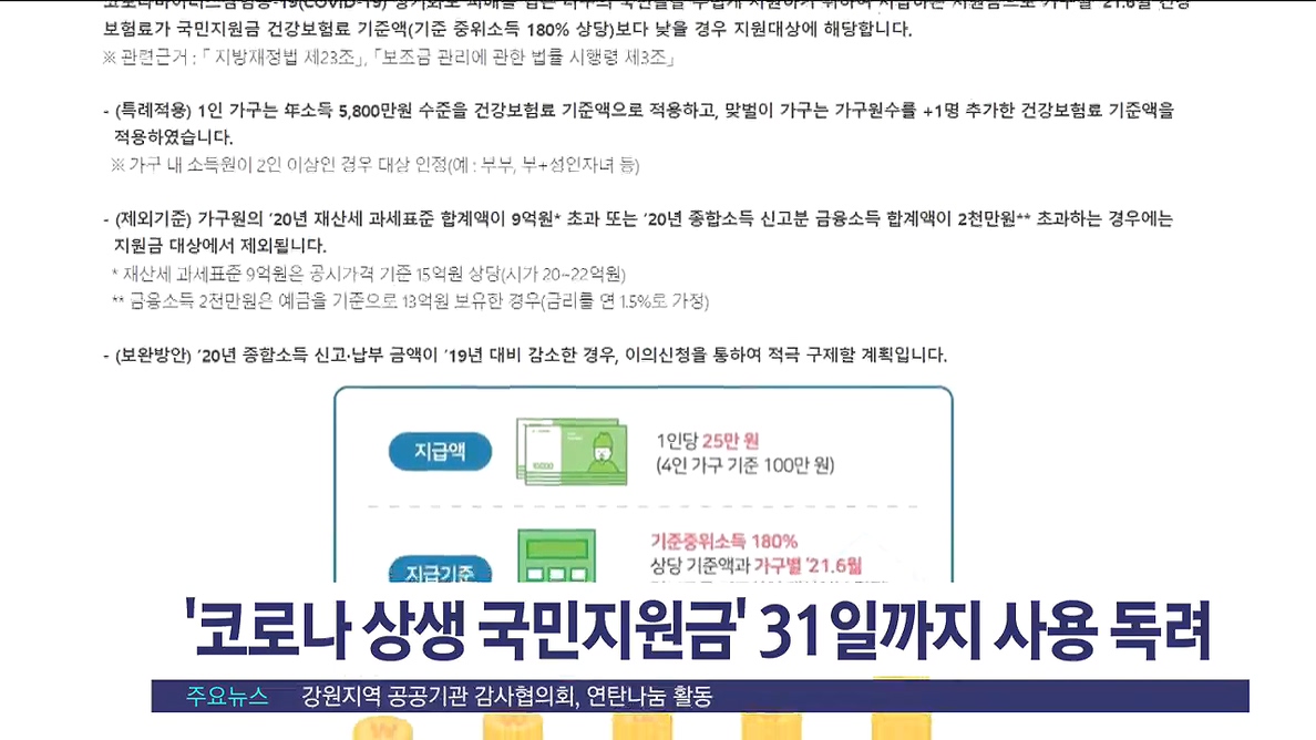 강원도는 '코로나 상생 국민지원금' 사용 마감일인 오는 31일까지 잔액을 사용할 수 있도록 일선 주민센터와 이·통장 회의 등을 통해 적극 홍보하기로 했습니다.