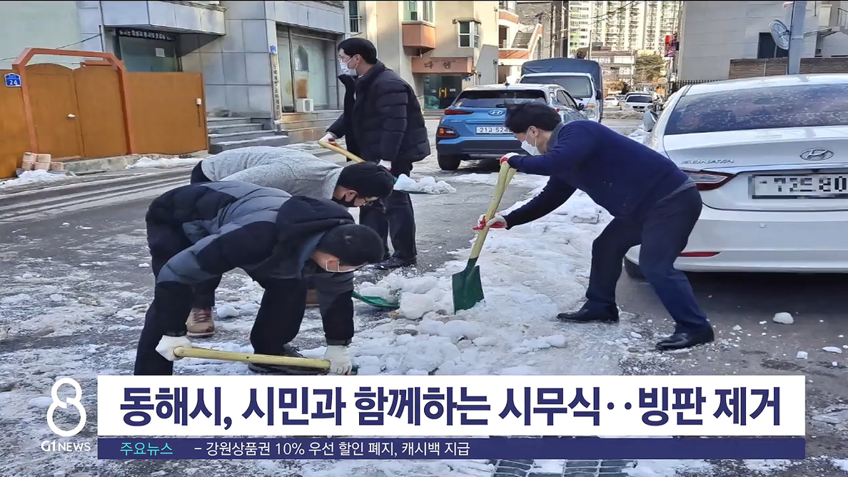 동해시는 오늘(3일) 새해 첫 업무로 시청 전 직원들이 참여한 가운데 노약자 통행이 많은 시장과 아파트 등을 중심으로 눈과 얼음을 치우는 '시민과 함께하는 시무식'을 진행했습니다.