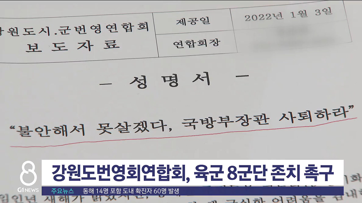 강원도시군번영회연합회는 성명을 내고 "새해 첫날 민간인 추정 1명이 월북해 주민들이 불안에 떨고 있다"며, 튼튼한 국방을 위해 해체 예정인 8군단을 존치하라고 촉구했습니다.