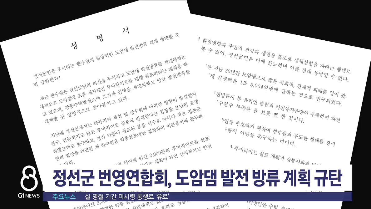 정선군 번영연합회는 오늘(25일) 성명을 통해 "한수원이 도암댐에 조류 제거제인 루미라이트를 대량 살포하려는 계획을 추진하려 한다"며"발전 방류를 목적으로 강릉수력발전소에 조직과 인력을 재배치하려는 계획을 전면 철회하라"고 촉구했습니다.
