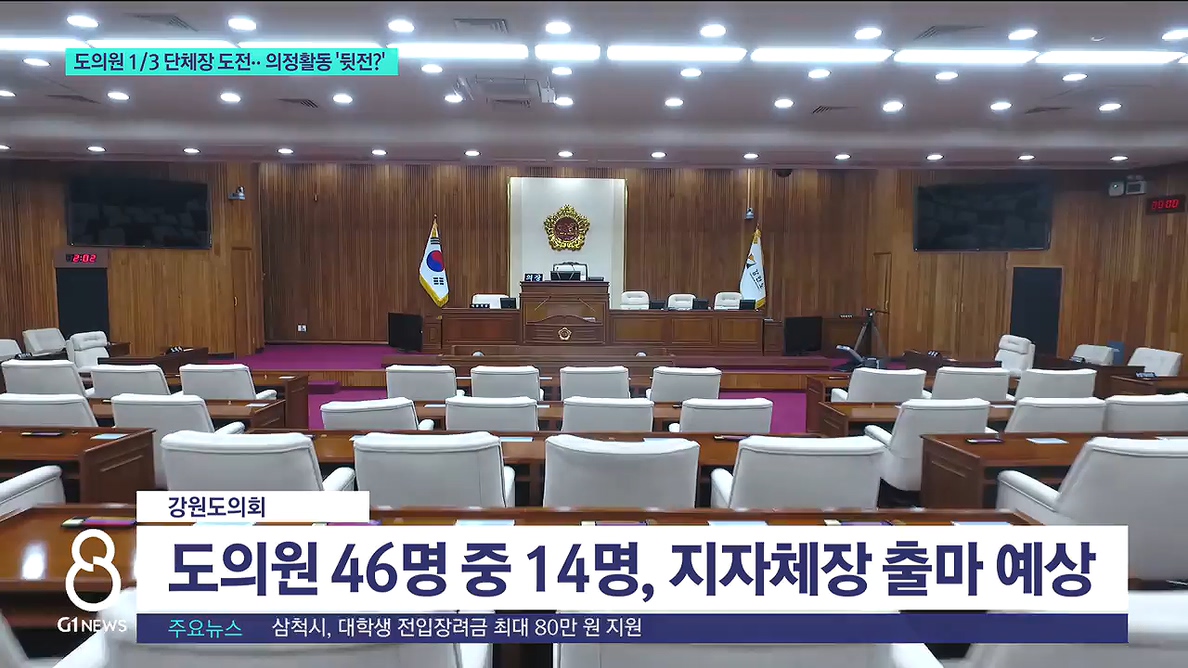 "이처럼 강원도의원 가운데 1/3인 14명이 단체장 출마 의사를 피력하면서, 강원도의회 일정에 차질을 우려하는 목소리도 이어지고 있습니다."